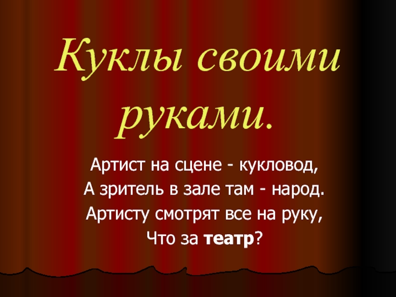 Куклы своими руками. Артист на сцене - кукловод,А зритель в зале там - народ.Артисту смотрят все на руку,Что за театр?