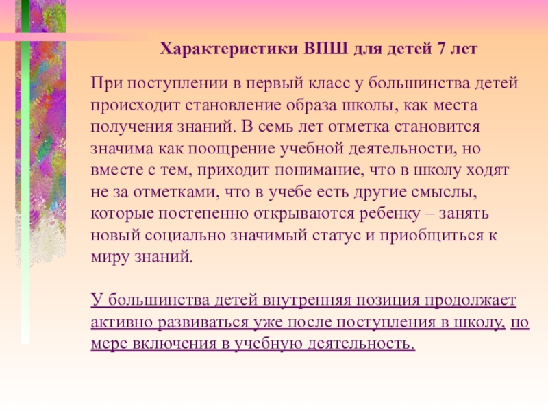 Такая позиция формируется почти у всех детей к 7 годам. Но если ребенок слышит от родителей или близких негативную информацию о школе,что отношение к нему и его занятиям в семье не меняется оттого, что он идет в школу, то «внутренняя позиция школьника» может не сформироваться вообще!