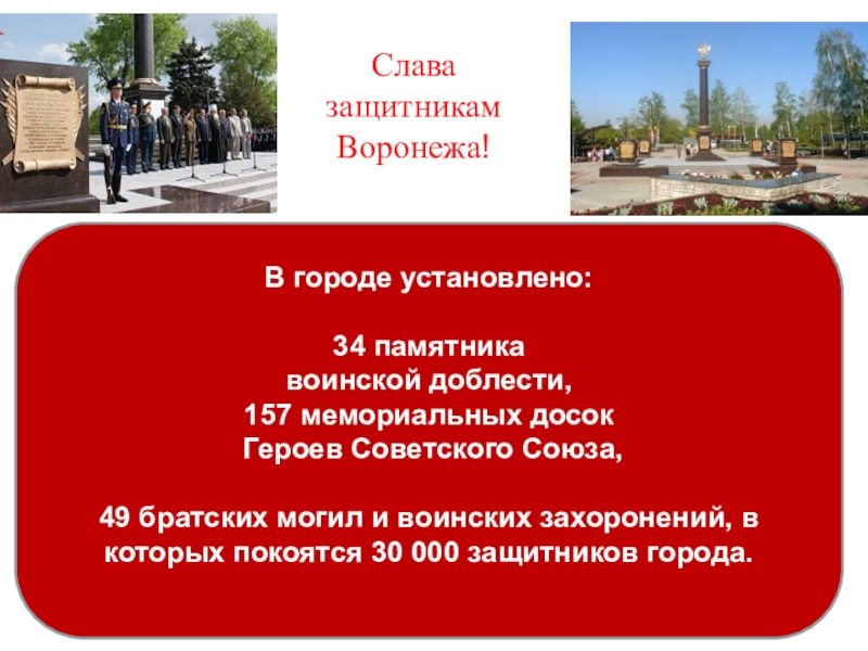 46 захоронений советских воинов в черте Воронежа. В этих братских могилах покоится более 27 тысяч солдат.