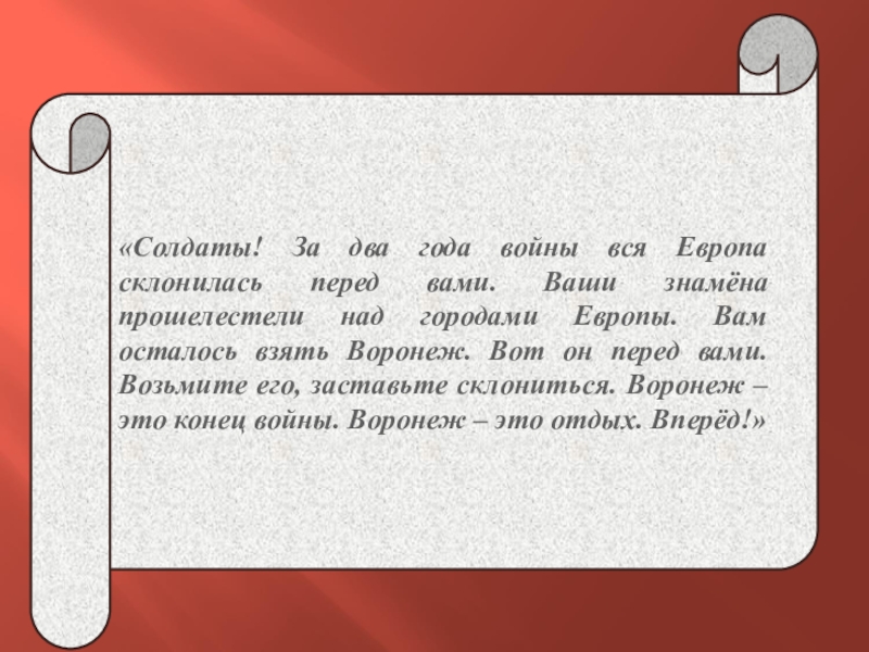 знамёна прошелестели над городами Европы. Вам осталось взять Воронеж. Вот он перед вами. Возьмите его, заставьте склониться. Воронеж – это конец войны. Воронеж – это отдых. Вперёд!»