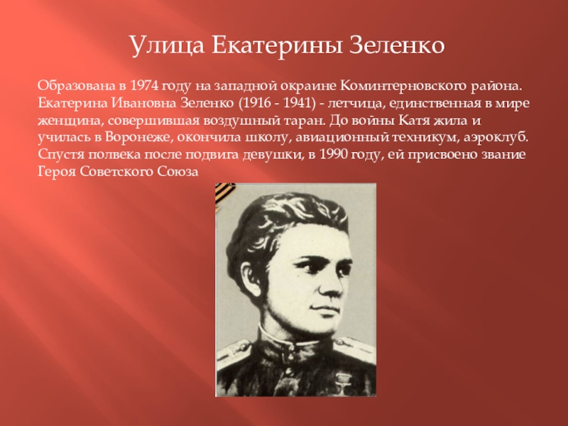 Екатерина Ивановна Зеленко (1916 - 1941) - летчица, единственная в мире женщина, совершившая воздушный таран. До войны Катя жила и училась в Воронеже, окончила школу, авиационный техникум, аэроклуб. Спустя полвека после подвига девушки, в 1990 году, ей присвоено звание Героя Советского Союза