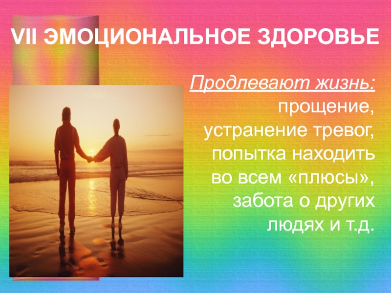 VII ЭМОЦИОНАЛЬНОЕ ЗДОРОВЬЕПродлевают жизнь: прощение, устранение тревог, попытка находить во всем «плюсы», забота о других людях и