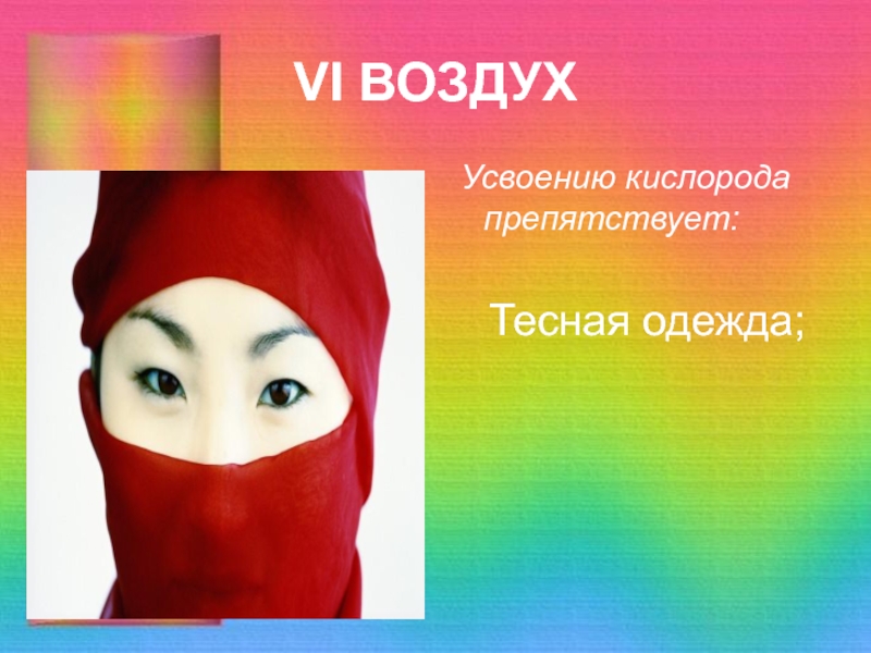 VI ВОЗДУХ Усвоению кислорода препятствует:  Тесная одежда;