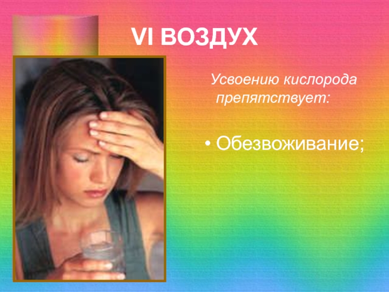 VI ВОЗДУХ Усвоению кислорода препятствует:Обезвоживание;