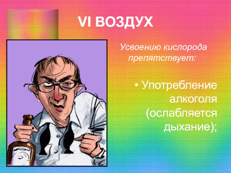 VI ВОЗДУХУсвоению кислорода препятствует:Употребление алкоголя (ослабляется дыхание);
