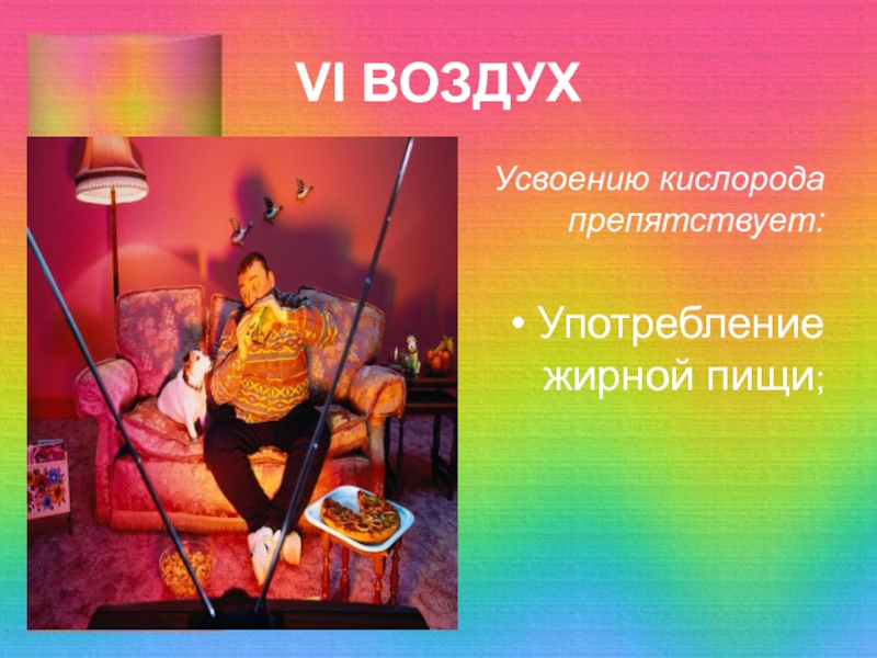 VI ВОЗДУХУсвоению кислорода препятствует:Употребление жирной пищи;