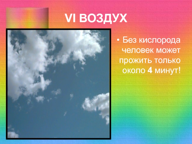 VI ВОЗДУХБез кислорода человек может прожить только около 4 минут!