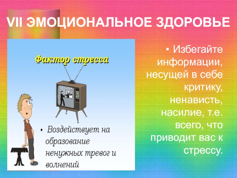 VII ЭМОЦИОНАЛЬНОЕ ЗДОРОВЬЕИзбегайте информации, несущей в себе критику, ненависть, насилие, т.е. всего, что приводит вас к стрессу.