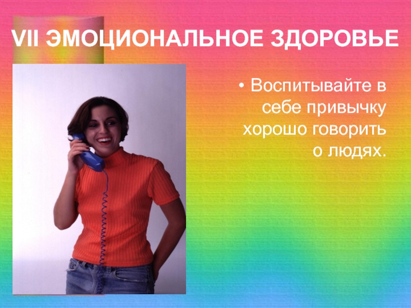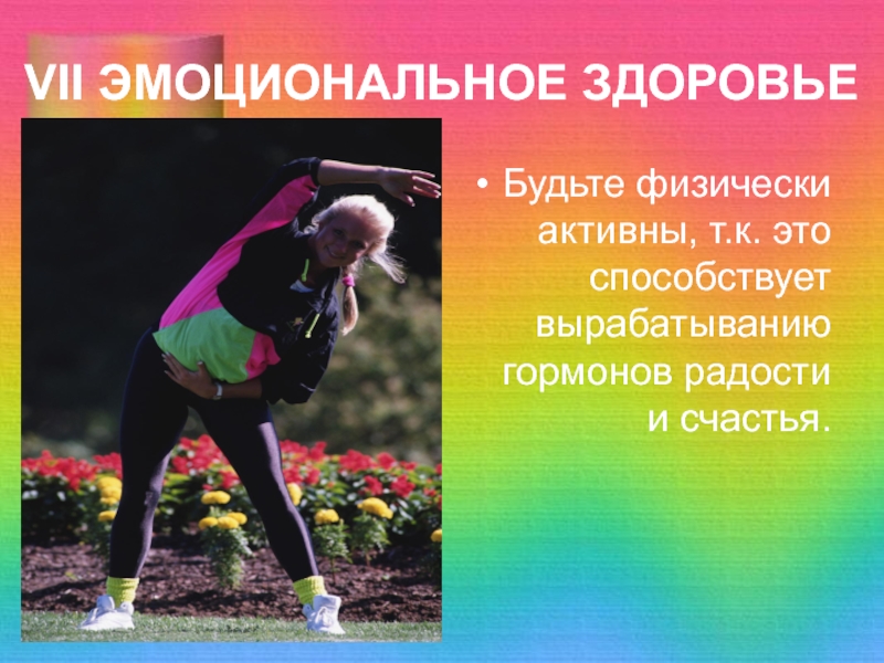 VII ЭМОЦИОНАЛЬНОЕ ЗДОРОВЬЕБудьте физически активны, т.к. это способствует вырабатыванию гормонов радости и счастья.