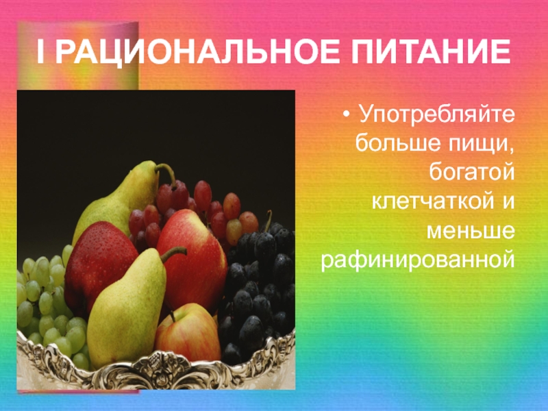 I РАЦИОНАЛЬНОЕ ПИТАНИЕУпотребляйте больше пищи, богатой клетчаткой и меньше рафинированной