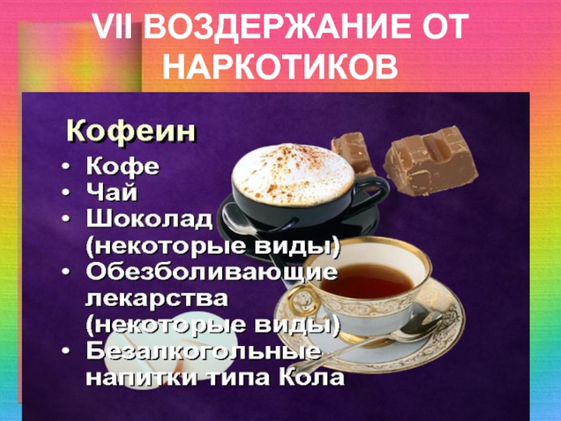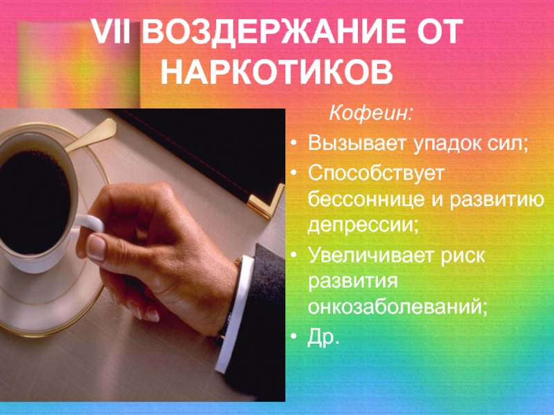 VII ВОЗДЕРЖАНИЕ ОТ НАРКОТИКОВ    Кофеин:Вызывает упадок сил;Способствует бессоннице и развитию депрессии;Увеличивает риск развития онкозаболеваний;Др.