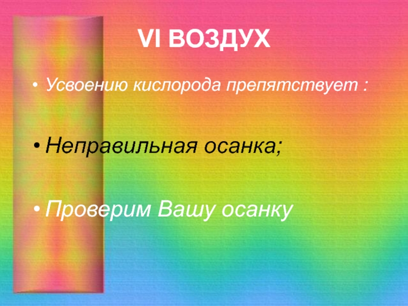 VI ВОЗДУХУсвоению кислорода препятствует :Неправильная осанка;Проверим Вашу осанку