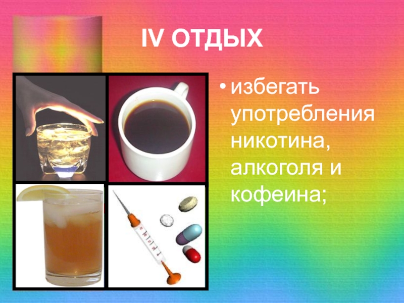 IV ОТДЫХизбегать употребления никотина, алкоголя и кофеина;