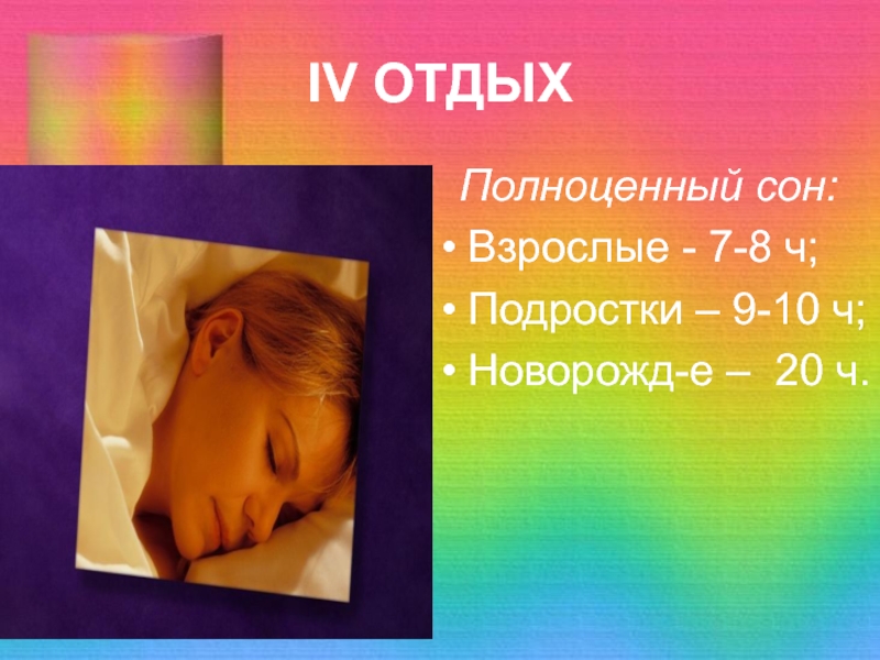 IV ОТДЫХ Полноценный сон:Взрослые - 7-8 ч;Подростки – 9-10 ч;Новорожд-е – 20 ч.