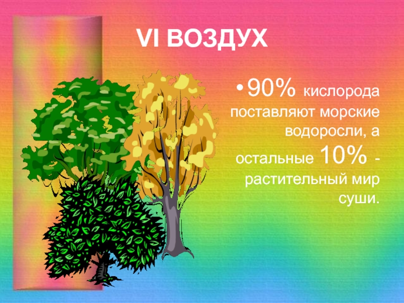 VI ВОЗДУХ90% кислорода поставляют морские водоросли, а остальные 10% - растительный мир суши.