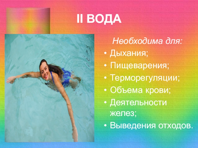 II ВОДА  Необходима для:Дыхания;Пищеварения;Терморегуляции;Объема крови;Деятельности желез;Выведения отходов.