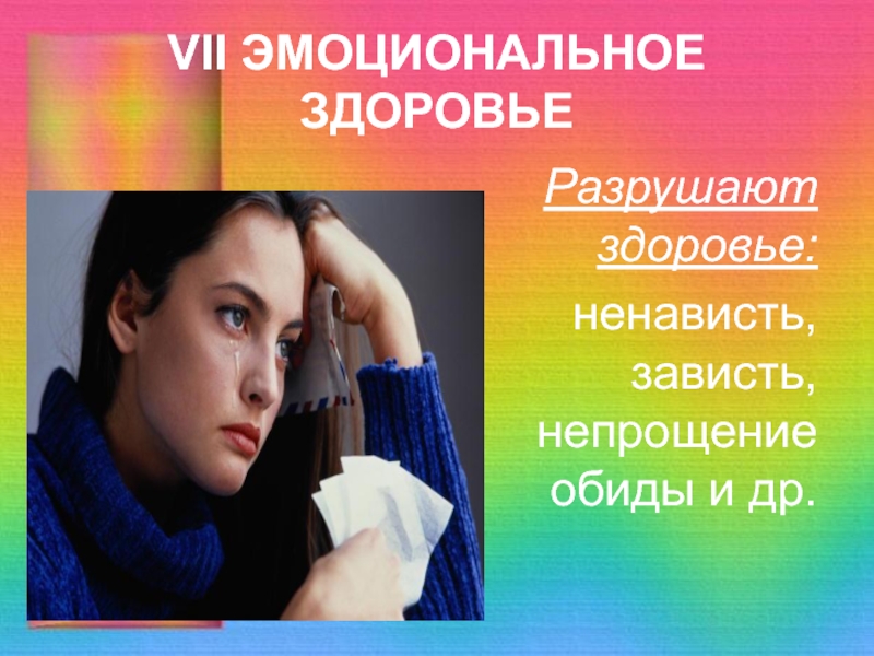 VII ЭМОЦИОНАЛЬНОЕ ЗДОРОВЬЕРазрушают здоровье: ненависть, зависть, непрощение обиды и др.