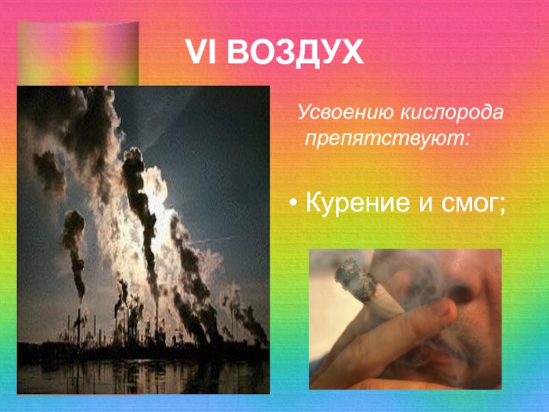 VI ВОЗДУХ Усвоению кислорода препятствуют:Курение и смог;