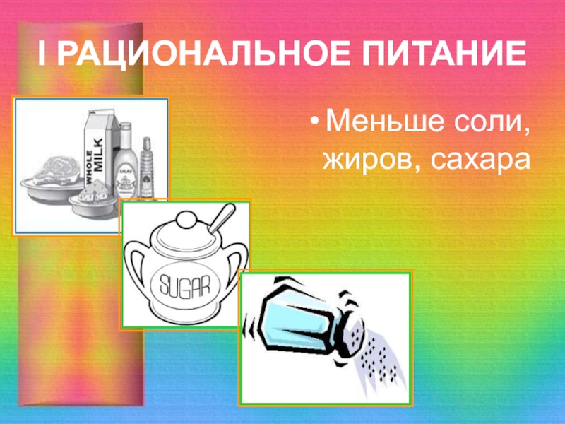 I РАЦИОНАЛЬНОЕ ПИТАНИЕМеньше соли, жиров, сахара