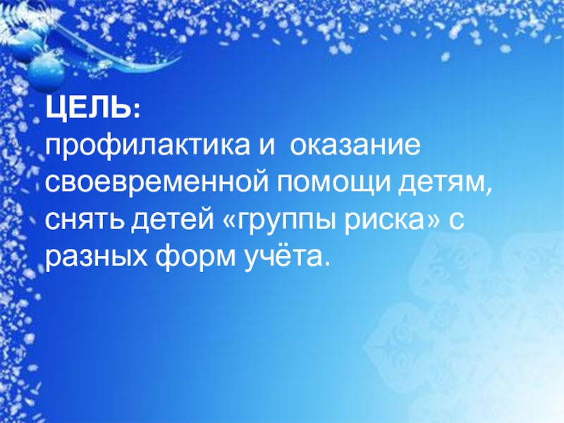 Слайд 2ЦЕЛЬ: профилактика и  оказание своевременной помощи детям, снять детей «группы риска»