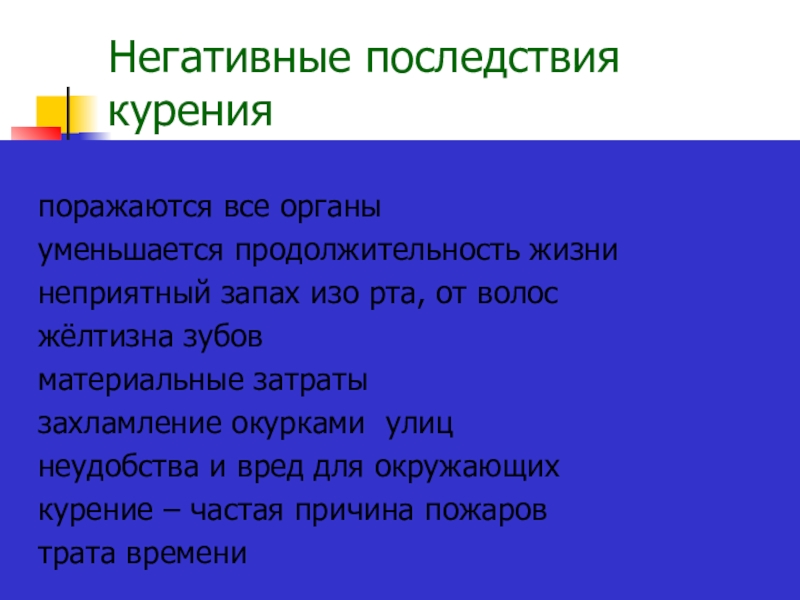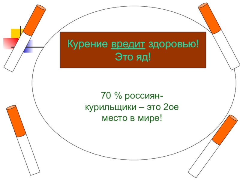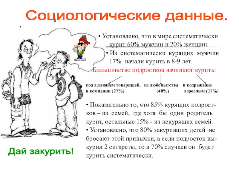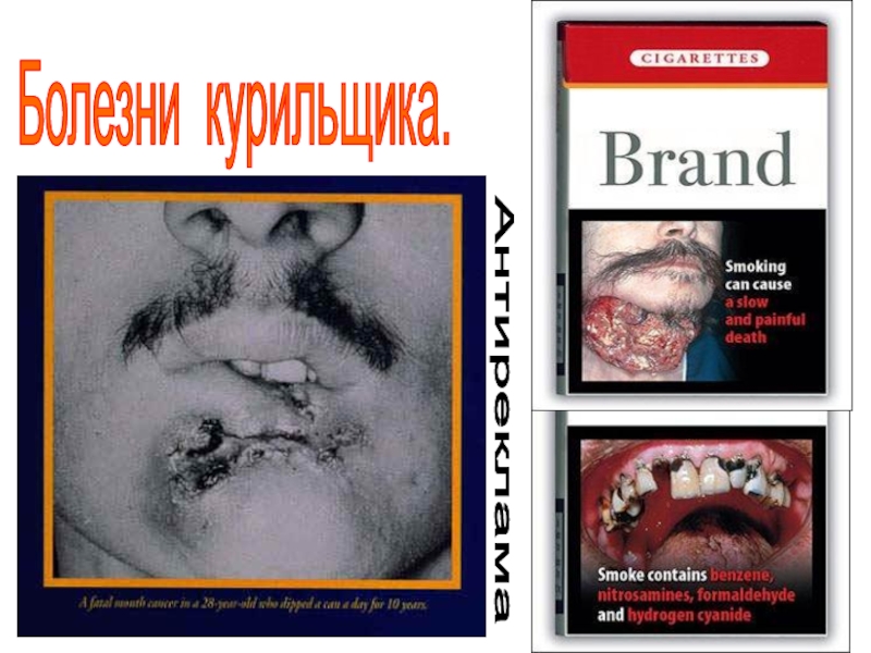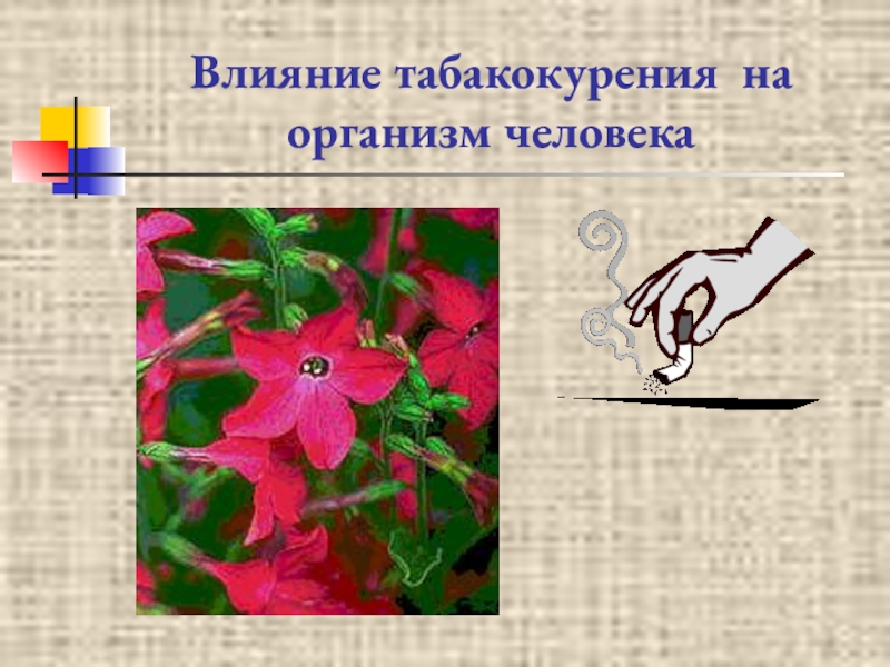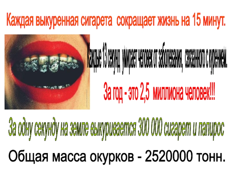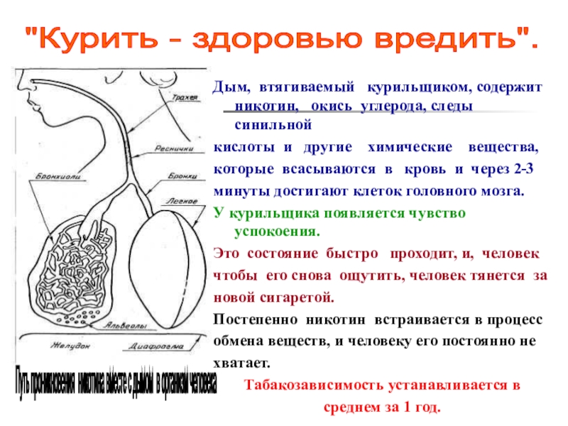 Слайд 23Дым, втягиваемый курильщиком, содержит никотин, окись углерода, следы синильной