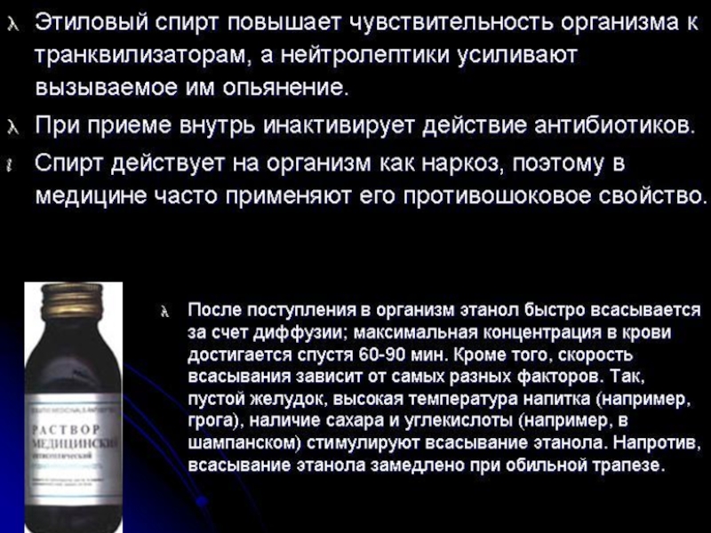 Яд имеет свойство накапливаться. После приёма кружки пива, стакана вина, 100 граммов водки — содержащийся в них спирт всасывается в кровь, с кровотоком идёт в мозг и у человека начинается процесс интенсивного разрушения его коры.