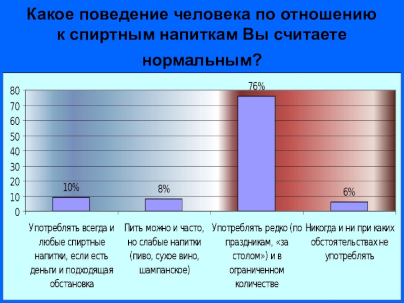 Слайд 12Какое поведение человека по отношению к спиртным напиткам Вы считаете нормальным?