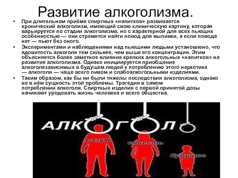 При длительном приёме спиртных «напитков» развивается хронический алкоголизм, имеющий свою клиническую картину, которая