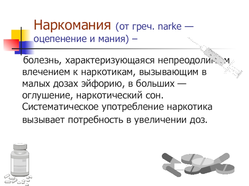 Слайд 50Наркомания (от греч. narke — оцепенение и мания) –