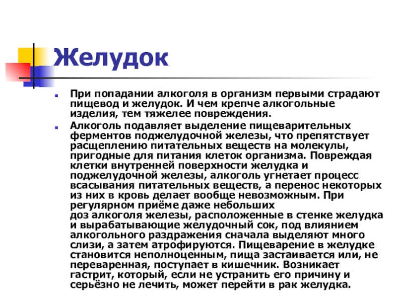 Алкоголь подавляет выделение пищеварительных ферментов поджелудочной железы, что препятствует расщеплению питательных веществ на молекулы, пригодные для питания клеток организма. Повреждая клетки внутренней поверхности желудка и поджелудочной железы, алкоголь угнетает процесс всасывания питательных веществ, а перенос некоторых из них в кровь делает вообще невозможным. При регулярном приёме даже небольших доз алкоголя железы, расположенные в стенке желудка и вырабатывающие желудочный сок, под влиянием алкогольного раздражения сначала выделяют много слизи, а затем атрофируются. Пищеварение в желудке становится неполноценным, пища застаивается или, не переваренная, поступает в кишечник. Возникает гастрит, который, если не устранить его причину и серьёзно не лечить, может перейти в рак желудка.