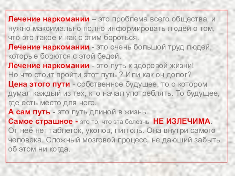 Слайд 56Лечение наркомании – это проблема всего общества, и нужно максимально полно