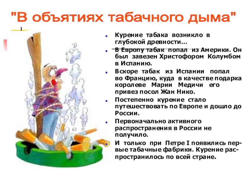 И только при Петре I появились пер-вые табачные фабрики. Курение рас- пространилось по всей стране.