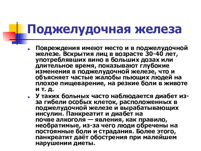 возрасте 30-40 лет, употреблявших вино в больших дозах или длительное время, показывают глубокие изменения в поджелудочной железе, что и объясняет частые жалобы пьющих людей на плохое пищеварение, на резкие боли в животе и т. д.