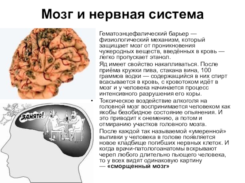 После каждой так называемой «умеренной» выпивки у человека в голове появляется новое кладбище погибших нервных клеток. И когда врачи-патологоанатомы вскрывают череп любого длительно пьющего человека, то у всех видят одинаковую картину — «сморщенный мозг»