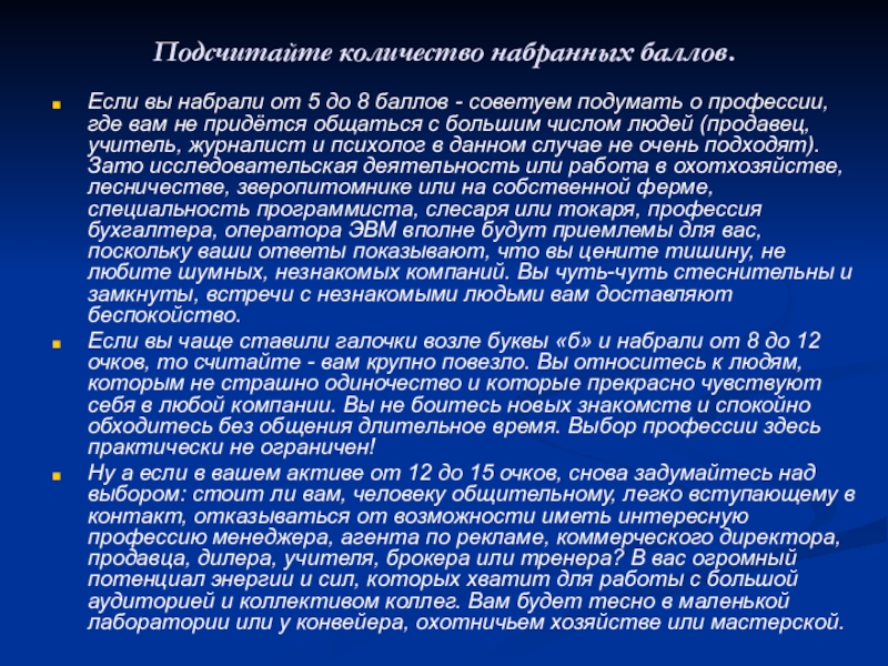 Если вы чаще ставили галочки возле буквы «б» и набрали от 8 до 12 очков, то считайте - вам крупно повезло. Вы относитесь к людям, которым не страшно одиночество и которые прекрасно чувствуют себя в любой компании. Вы не боитесь новых знакомств и спокойно обходитесь без общения длительное время. Выбор профессии здесь практически не ограничен!