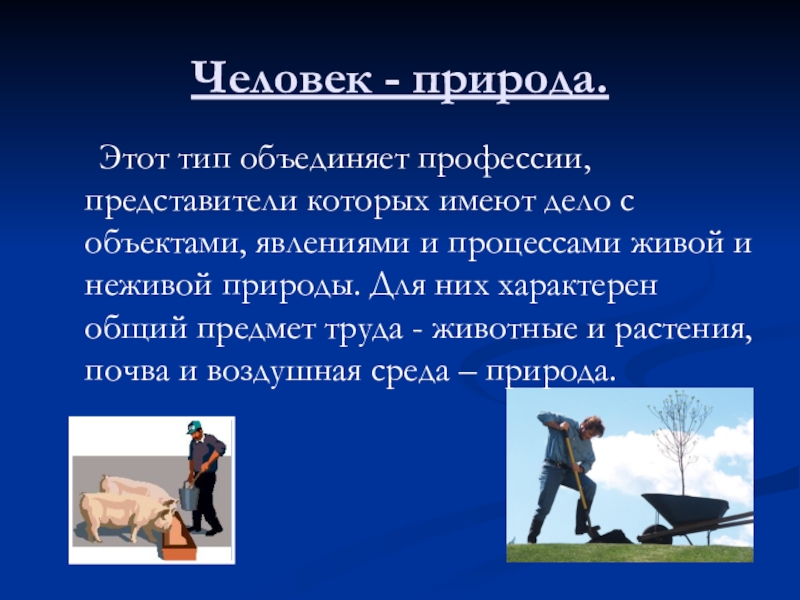 имеют дело с объектами, явлениями и процессами живой и неживой природы. Для них характерен общий предмет труда - животные и растения, почва и воздушная среда – природа.