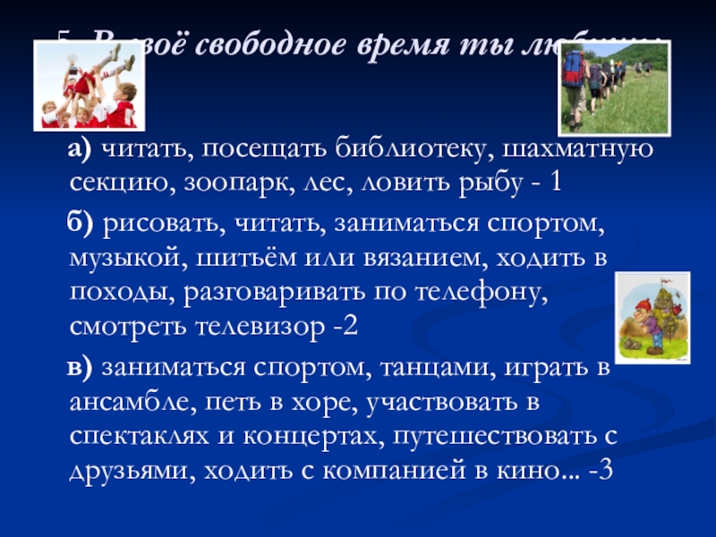 в) заниматься спортом, танцами, играть в ансамбле, петь в хоре, участвовать в спектаклях и концертах, путешествовать с друзьями, ходить с компанией в кино... -3