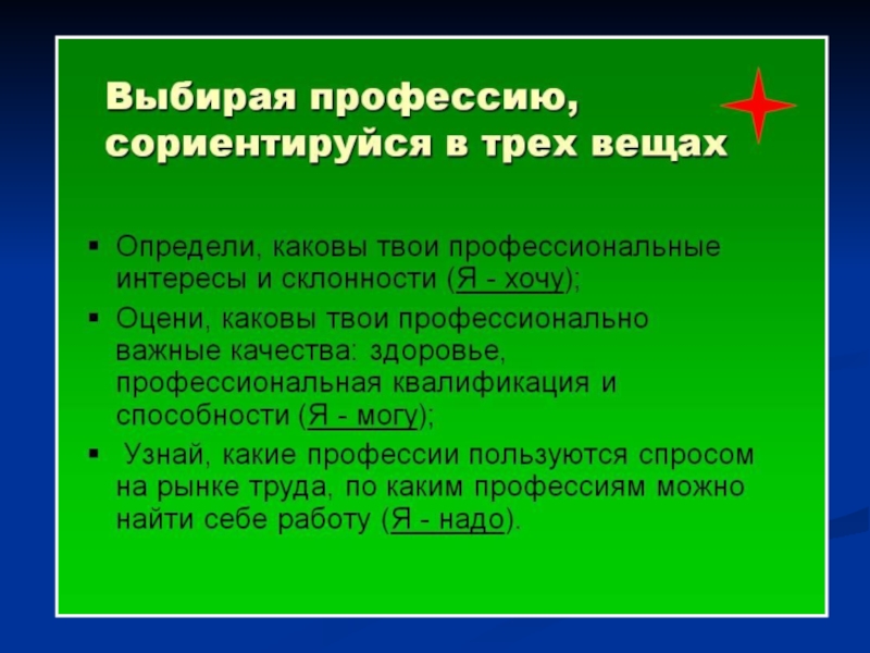 могу, надо», то профессиональный выбор будет удачен. Иными словами, надо выбрать такую профессию, которая будет интересной, соответствовать способностям и пользоваться спросом на рынке труда.