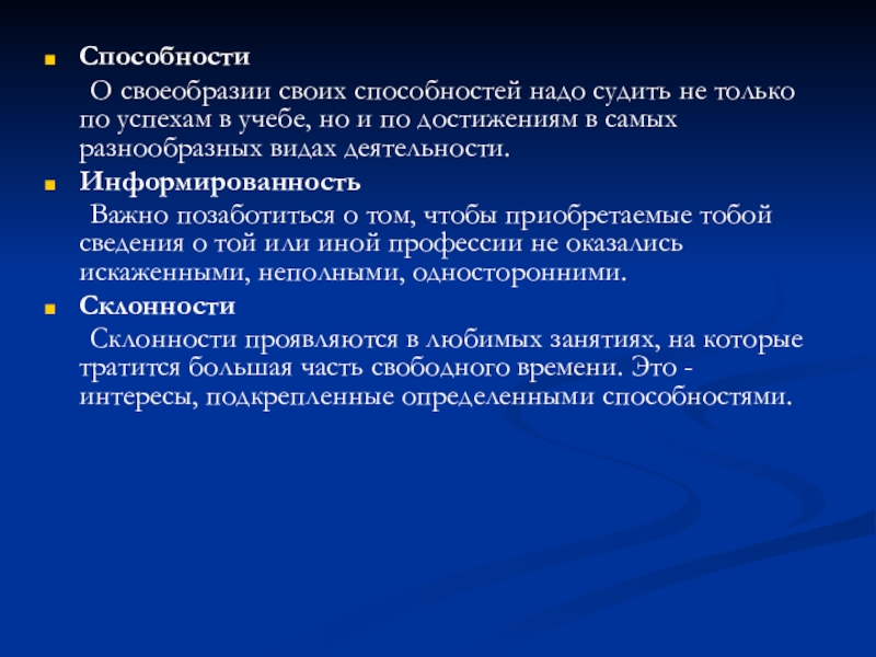 Склонности проявляются в любимых занятиях, на которые тратится большая часть свободного времени. Это - интересы, подкрепленные определенными способностями.