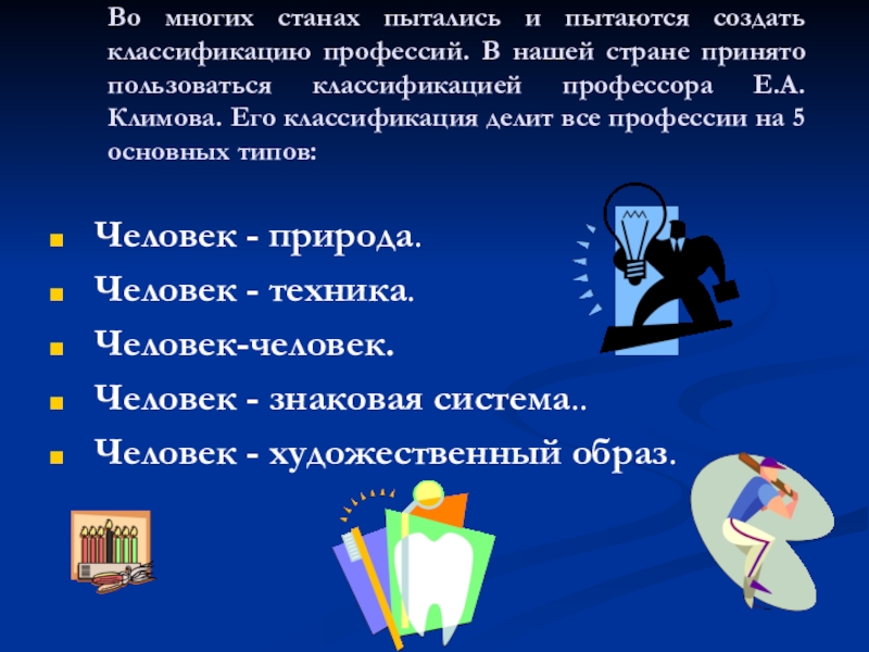 стране принято пользоваться классификацией профессора Е.А. Климова. Его классификация делит все профессии на 5 основных типов: