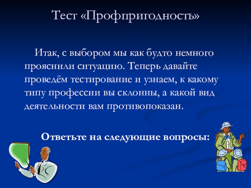 немного прояснили ситуацию. Теперь давайте проведём тестирование и узнаем, к какому типу профессии вы склонны, а какой вид деятельности вам противопоказан.