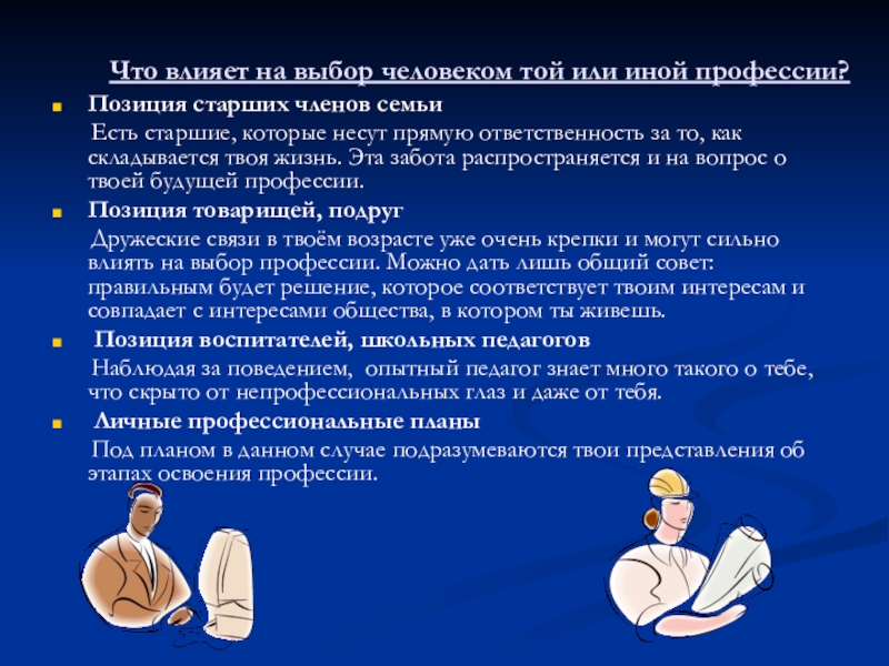 Слайд 11 Что влияет на выбор человеком той или иной профессии?