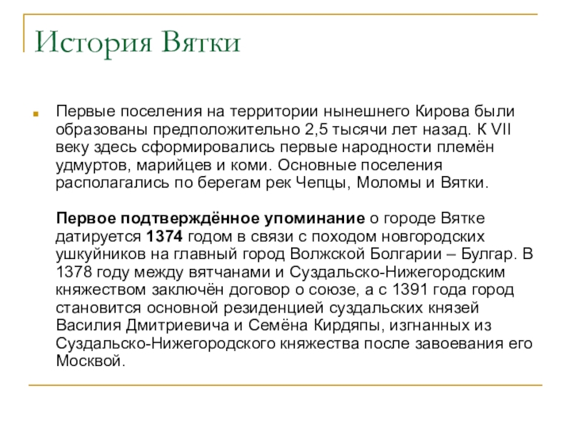 тысячи лет назад. К VII веку здесь сформировались первые народности племён удмуртов, марийцев и коми. Основные поселения располагались по берегам рек Чепцы, Моломы и Вятки. Первое подтверждённое упоминание о городе Вятке датируется 1374 годом в связи с походом новгородских ушкуйников на главный город Волжской Болгарии – Булгар. В 1378 году между вятчанами и Суздальско-Нижегородским княжеством заключён договор о союзе, а с 1391 года город становится основной резиденцией суздальских князей Василия Дмитриевича и Семёна Кирдяпы, изгнанных из Суздальско-Нижегородского княжества после завоевания его Москвой.