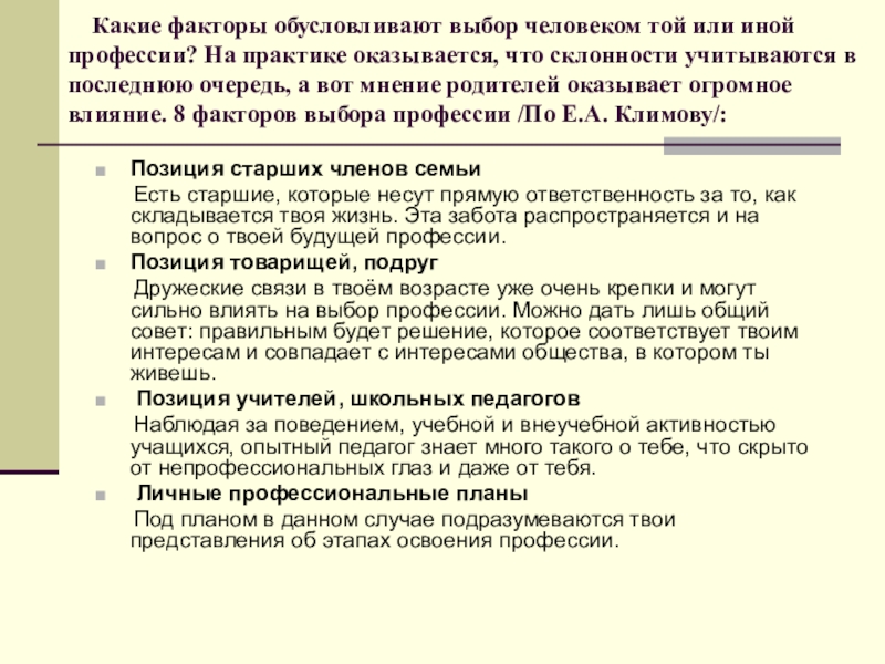 На практике оказывается, что склонности учитываются в последнюю очередь, а вот мнение родителей оказывает огромное влияние. 8 факторов выбора профессии /По Е.А. Климову/: