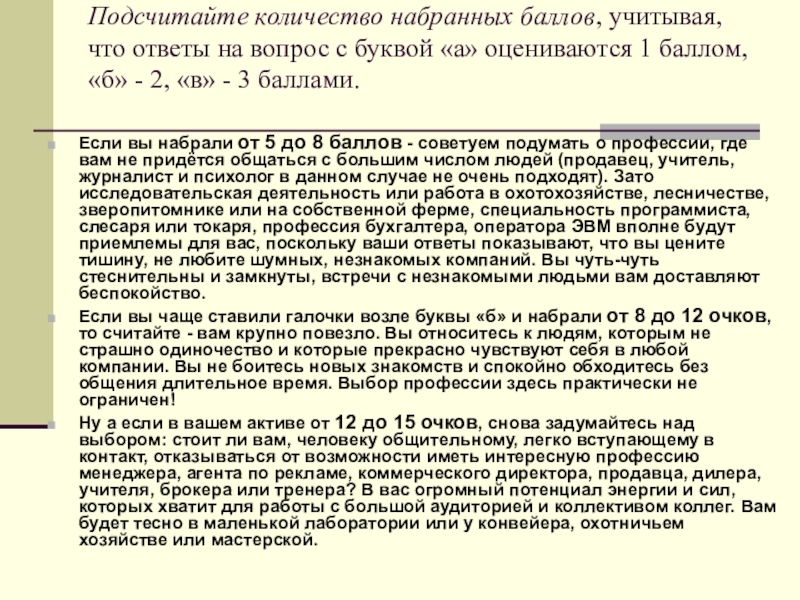 Если вы набрали от 5 до 8 баллов - советуем подумать о профессии, где вам не придётся общаться с большим числом людей (продавец, учитель, журналист и психолог в данном случае не очень подходят). Зато исследовательская деятельность или работа в охотохозяйстве, лесничестве, зверопитомнике или на собственной ферме, специальность программиста, слесаря или токаря, профессия бухгалтера, оператора ЭВМ вполне будут приемлемы для вас, поскольку ваши ответы показывают, что вы цените тишину, не любите шумных, незнакомых компаний. Вы чуть-чуть стеснительны и замкнуты, встречи с незнакомыми людьми вам доставляют беспокойство.