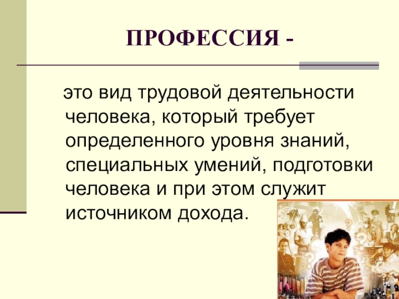 уровня знаний, специальных умений, подготовки человека и при этом служит источником дохода.