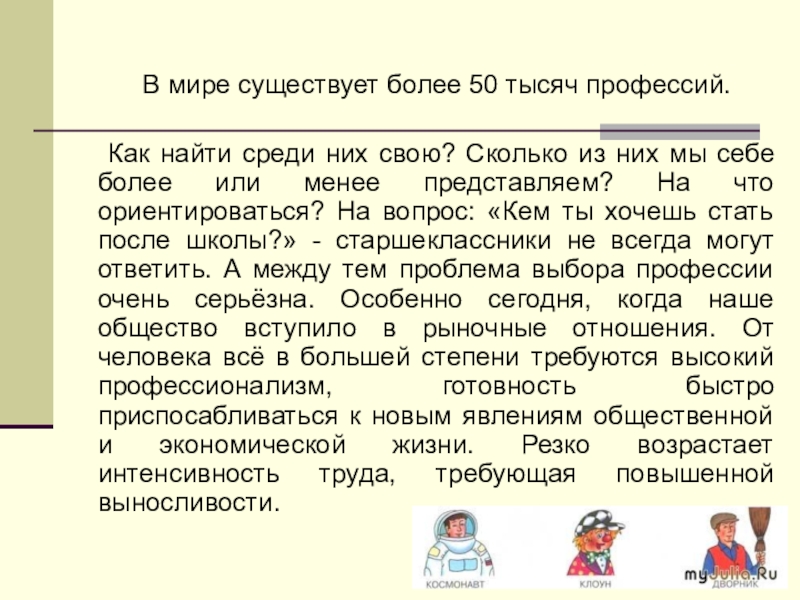 найти среди них свою? Сколько из них мы себе более или менее представляем? На что ориентироваться? На вопрос: «Кем ты хочешь стать после школы?» - старшеклассники не всегда могут ответить. А между тем проблема выбора профессии очень серьёзна. Особенно сегодня, когда наше общество вступило в рыночные отношения. От человека всё в большей степени требуются высокий профессионализм, готовность быстро приспосабливаться к новым явлениям общественной и экономической жизни. Резко возрастает интенсивность труда, требующая повышенной выносливости.