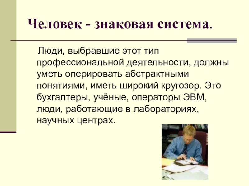 должны уметь оперировать абстрактными понятиями, иметь широкий кругозор. Это бухгалтеры, учёные, операторы ЭВМ, люди, работающие в лабораториях, научных центрах.