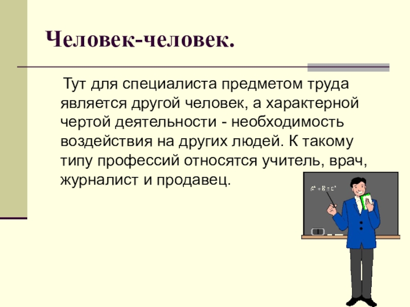 характерной чертой деятельности - необходимость воздействия на других людей. К такому типу профессий относятся учитель, врач, журналист и продавец.