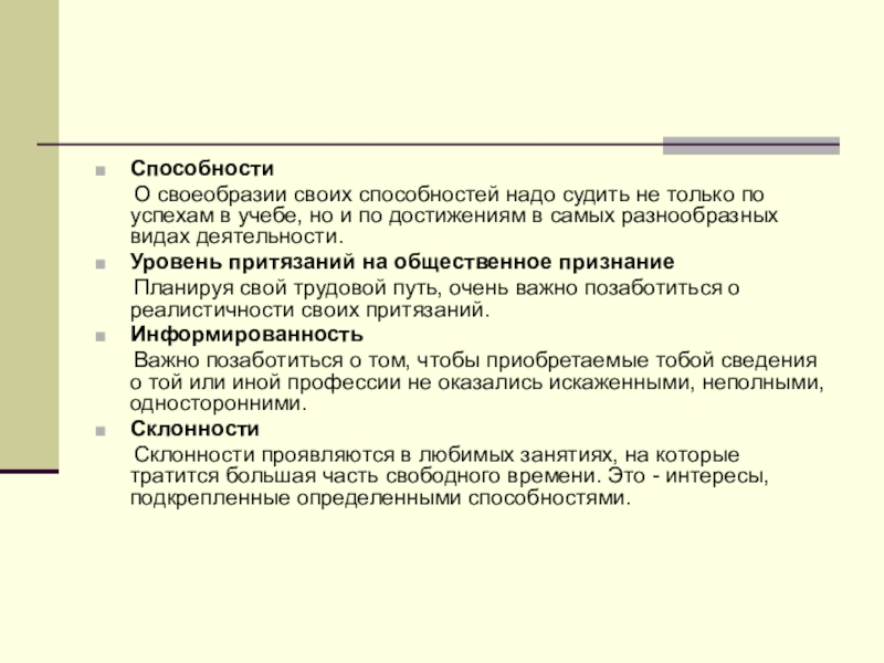 Склонности проявляются в любимых занятиях, на которые тратится большая часть свободного времени. Это - интересы, подкрепленные определенными способностями.